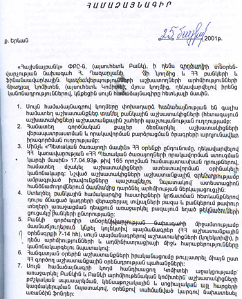 BRANCH REPUBLICAL UNION OF BANKS, FINANCIAL INSTITUTIONS EMPLOYEES AND PROFESSIONAL EMPLOYEES OF TRADE OF ARMENIA